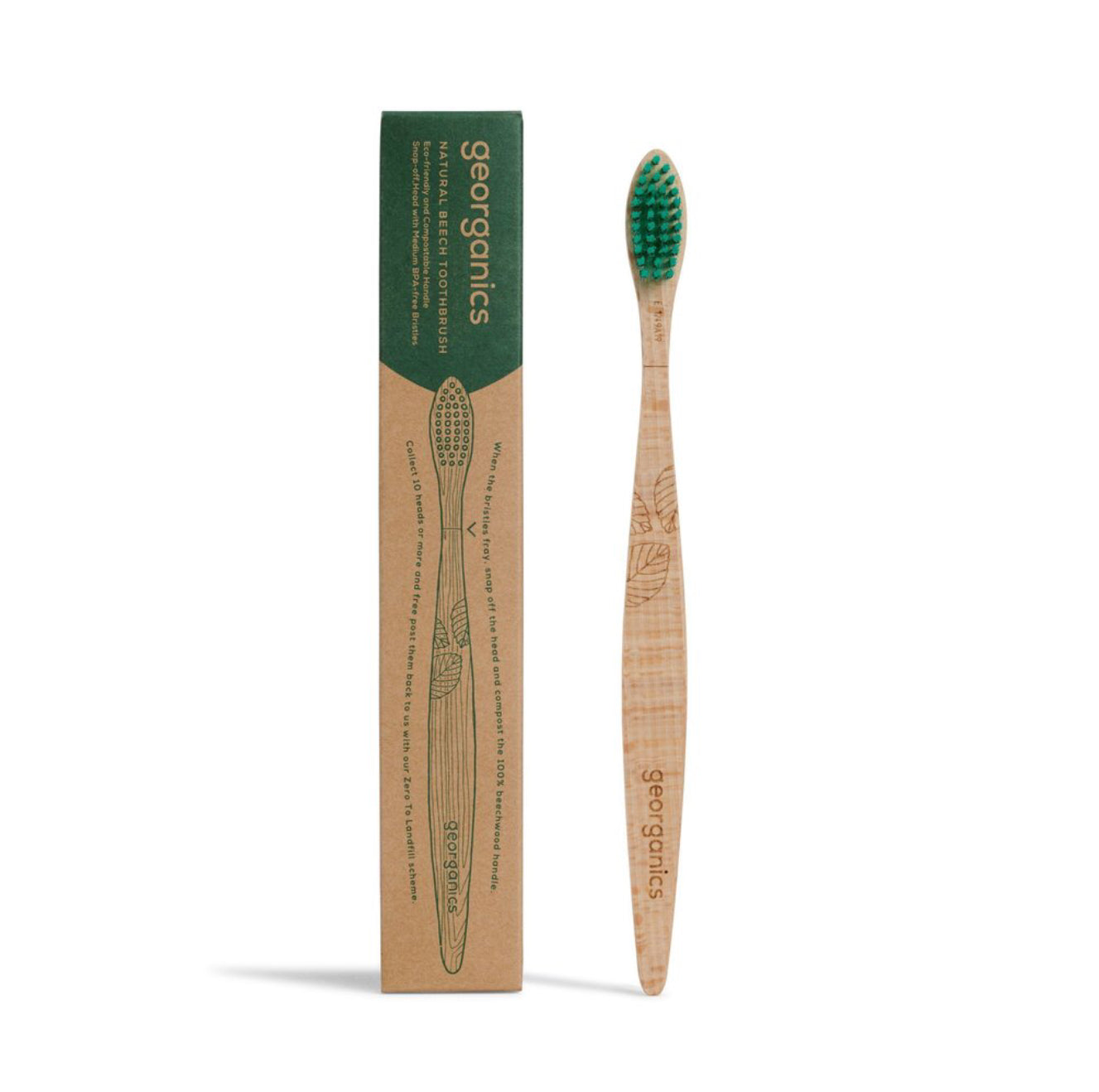 This adult toothbrush's handle is made from sustainable FSC Beechwood, suitable for home compost.