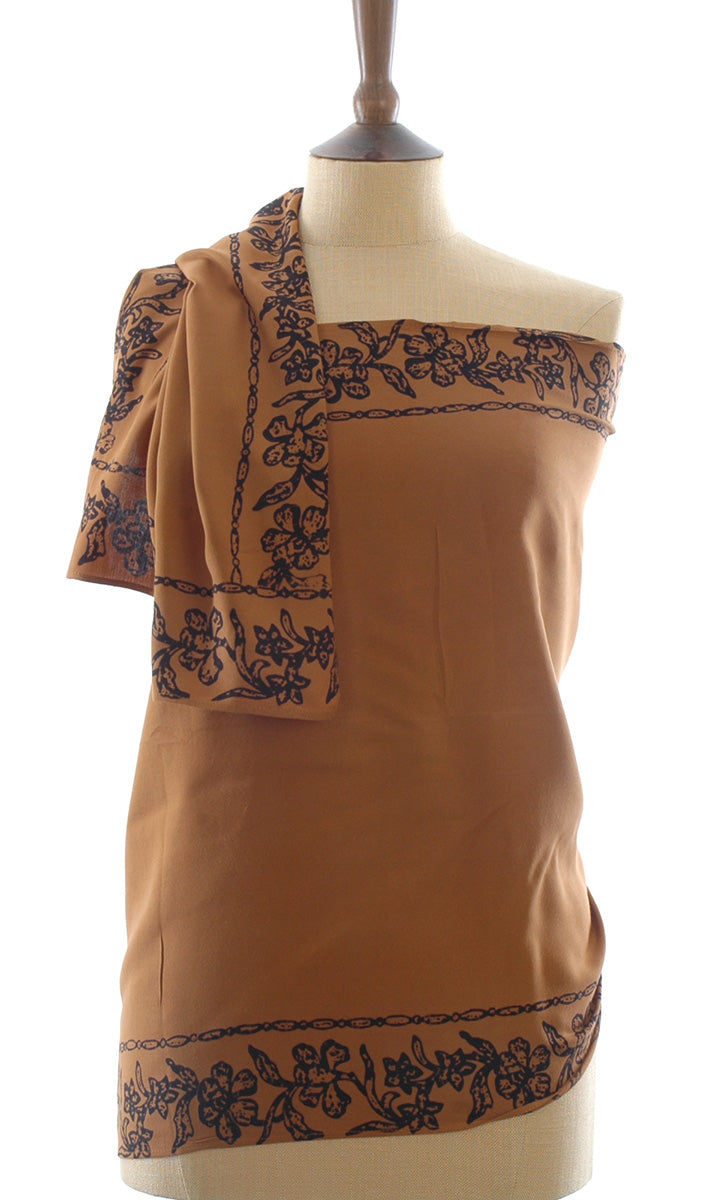 Gold batik scarf with black bali flowers border. Also available with a white border.