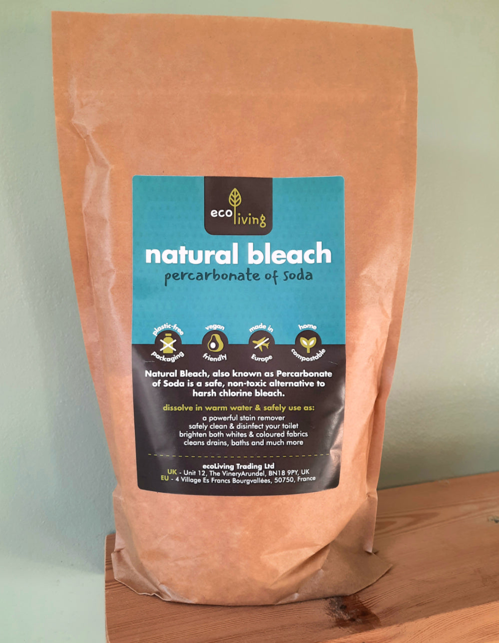 When dissolved in water it releases oxygen which acts as a powerful stain remover, deodoriser and disinfectant. Plastic free and home compostable packaging. The bag is resealable. 750g